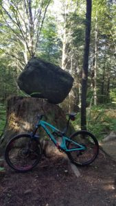 Another beautiful ride last night. I started too late in the day to get to the overlook that everybody talks about but even still at every clearing or opening in the trees a view of the mountains peaked through. Along the way I passed the stump of a tree with a giant boulder on top. All I can say is that would have been awesome to see – an enormous rock crashing down the side of the mountain, coming to rest precariously on the top of a stump.