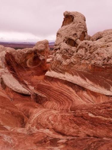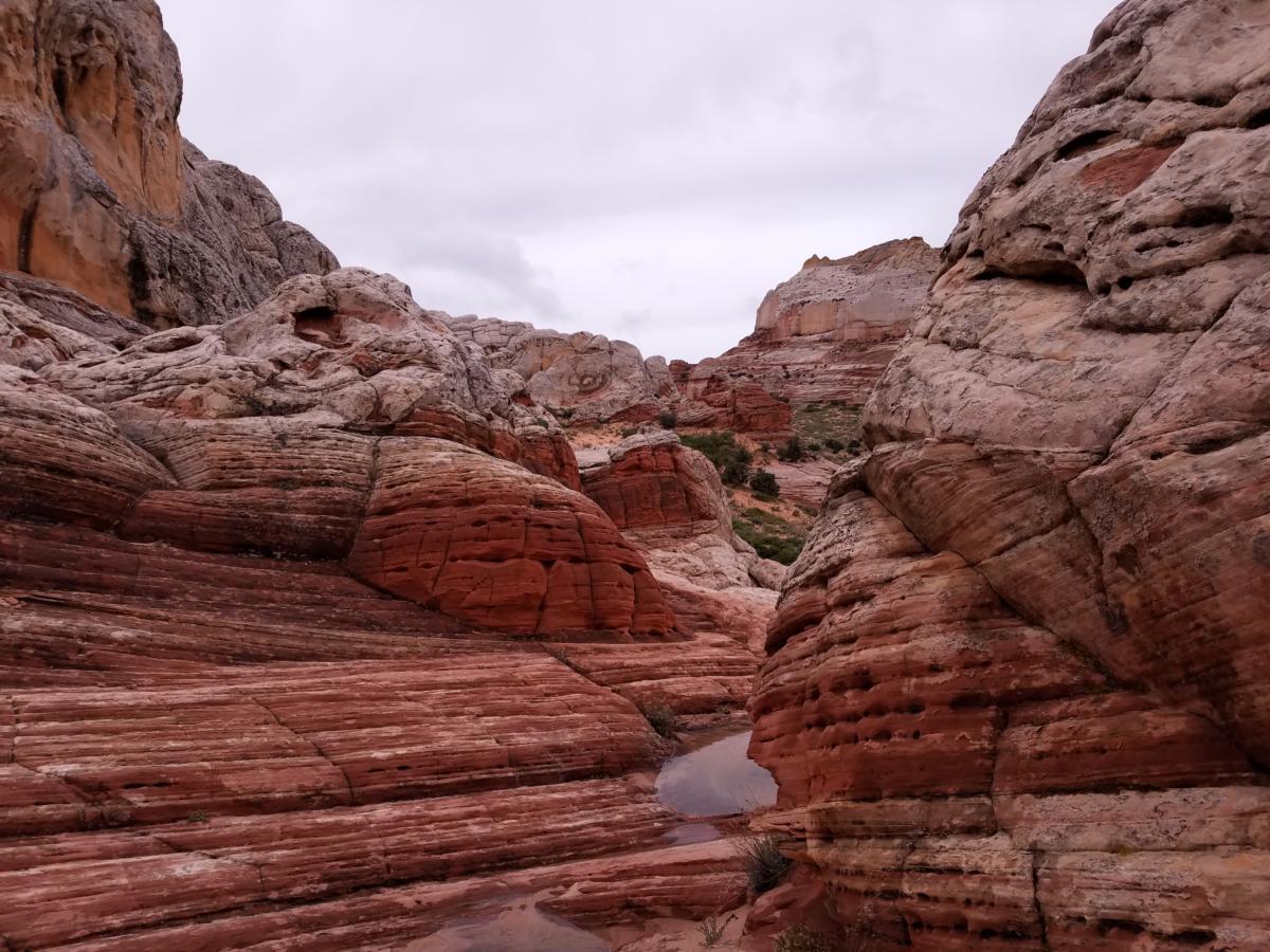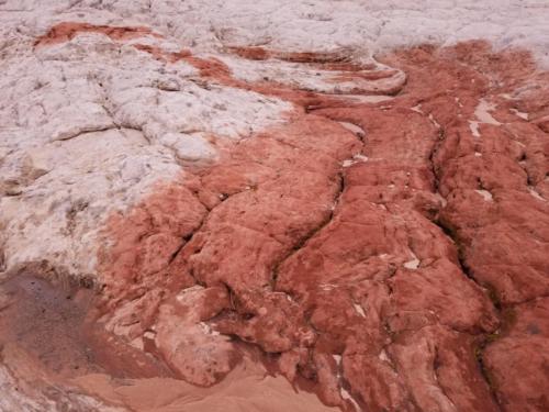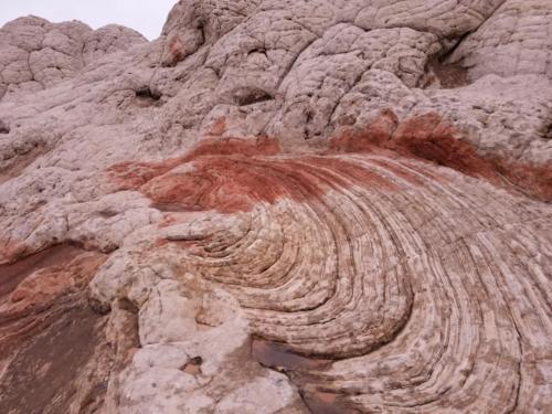 I went to a little place called White Pocket today. It is Way Way Way off the beaten path in northern Arizona. The drive out there was pretty sketchy with mud slides, wash outs, and massive puddles to meander through for about 20 miles before turning off onto a 12 mile single lane sandy trek through the wilderness during which time I did not see one single other soul. (At one point I got out to see how deep the sand was in the middle of the lane and it was midway up my calf.) I guess they mean it when they say 4×4 high clearance vehicles. The jeep did awesome and I learned a thing or two about four wheeling.