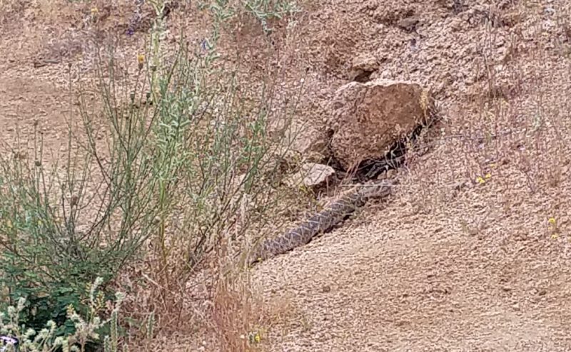 I knew there were rattle snakes in Phoenix AZ but as yet I hadn’t seen one. Today while hiking at Lake Bartlett just west of Carefree we suddenly came across a HUGE diamond back rattle snake sunning itself across the trail. As we are two sensible people we stopped short and took a few steps back. The snake began to move and coiled the top 1/8th of his body so he could get a better look at us. He lay there flicking his tongue tasting the air and feeling the vibrations trying to determine if we were a threat or not. Eventually he got tired of us standing there disturbing his relaxation and slithered up the hill and out of sight giving us safe passage. What a moment! What a memory!