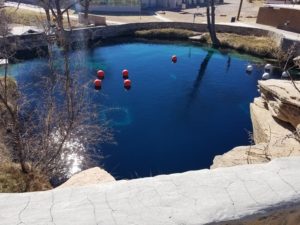The blue hole in Santa Rosa New Mexico is really quite neat. It’s name is a pretty good description of it. Surrounded by desert, sand, red Rock and dirt in comes almost out of nowhere. Basically it is a hole. At the top it’s about 80 ft in diameter but it opens up to about a hundred and thirty feet at the bottom. I had been looking forward to scuba diving in this spot because I have heard so many things about it, however I don’t have my own tank and there is only one dive shop in the area and it’s compressor was down. So I guess it will have to be something I do if I find myself in this area another time. Either way it was very cool especially because the water is always 61 degrees.